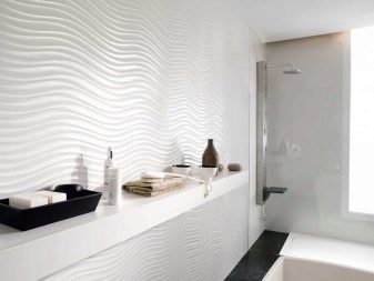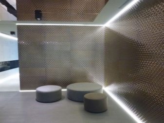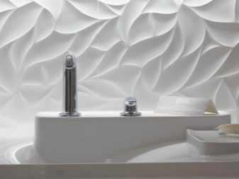 Today, the manufacturer has produced mosaic blocks with which you can build original panels, as well as fragments of photo wallpaper. Innovation is the production of tiles under crushed stone, imitations of metal - smooth and embossed.Such coatings are made in a classic and modern format, in modern style.