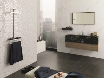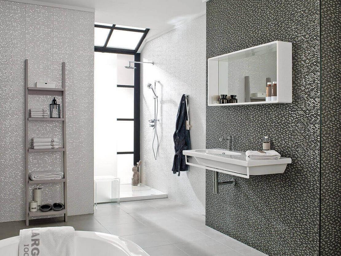 - Collection Porcelanosa jersey successfully combines traditional and modern motifs, combined with minimalism. Mosaic tiles under the “wild” stone are made in black, white, gray and mixed colors, giving it a special chic and originality.