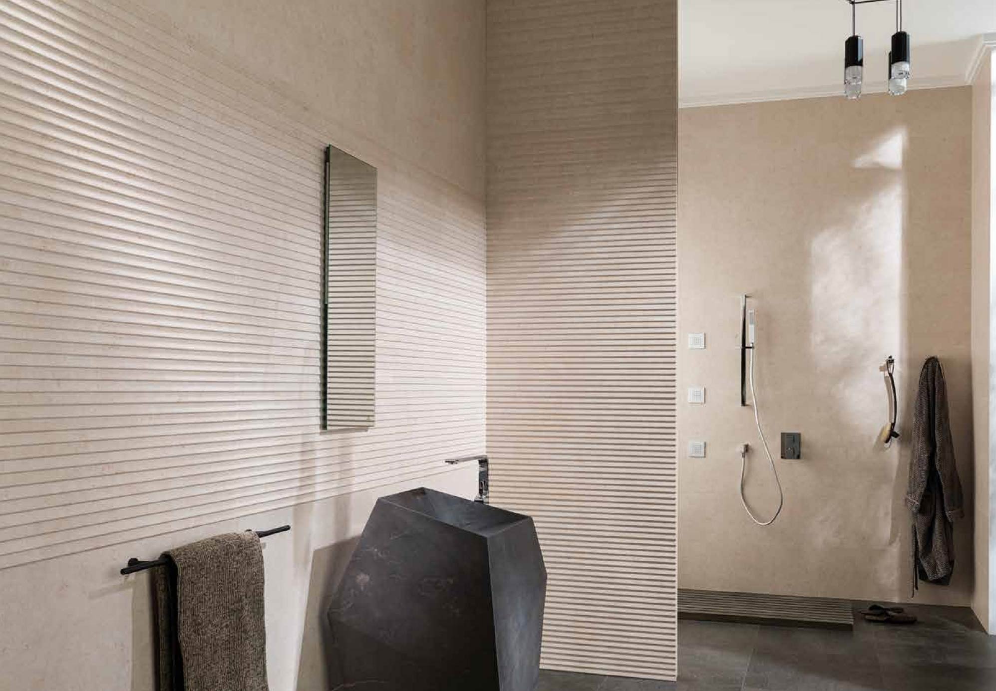 - Travertine Wall Plates - Another kind of successful and stylish coverage. The material has beautiful light and darker sand and beige tones, penetrated by parallel veins, and although the natural pattern is devoid of systematic and looks anarchic, it gives it even more attractiveness.