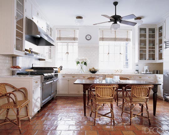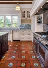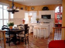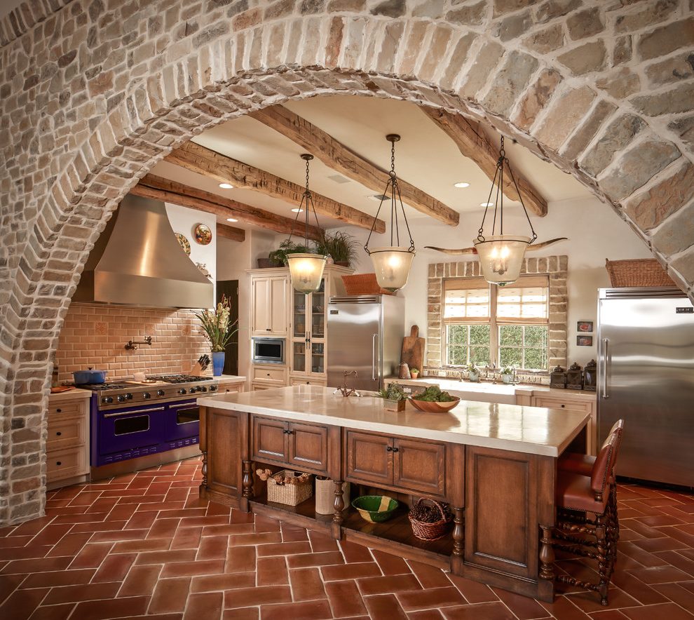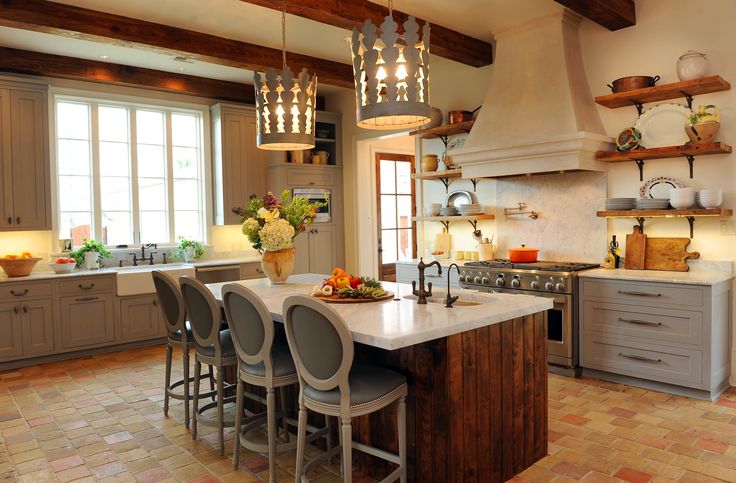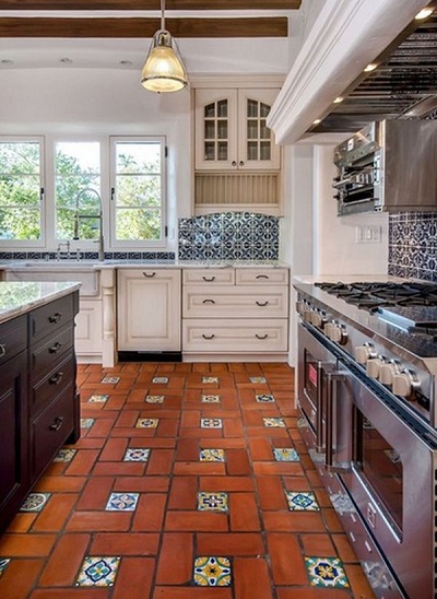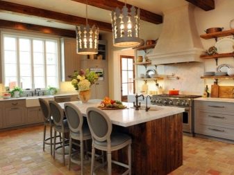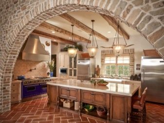 - The Mediterranean theme, complemented by a rustic, continues in the interior of the kitchen. Once again, floor tiles are harmoniously combined with brickwork and wooden beams on the ceiling. The room looks especially natural, durable. Using lighter tiles is logical in modern design kitchens.