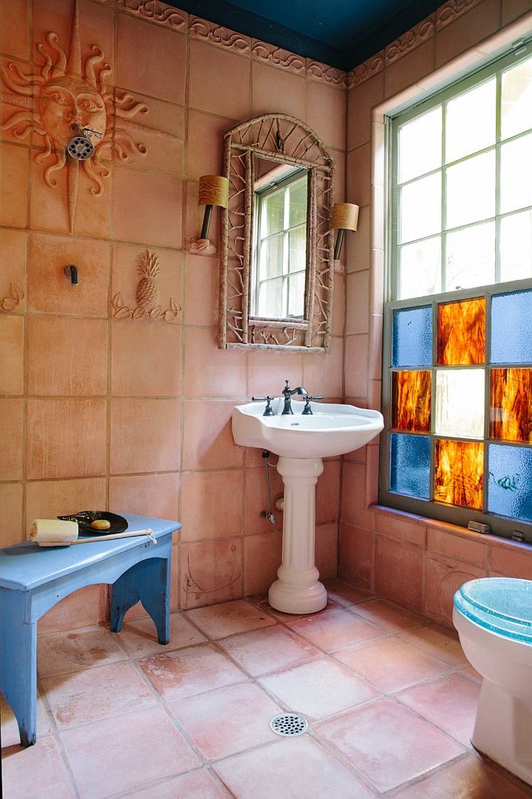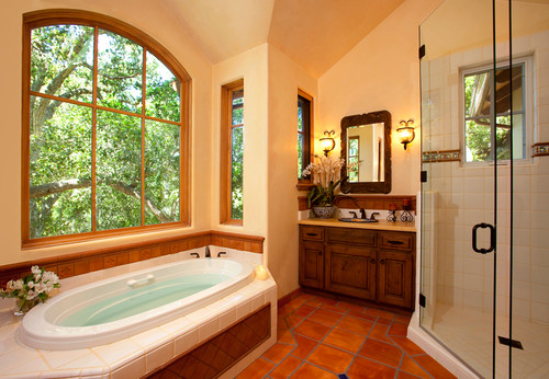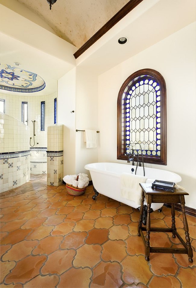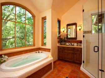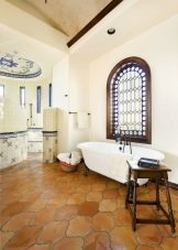 The combination of terracotta tiles with a brown scale get cozy chamber rooms. Unusual style effects guarantees a combination of material with green (shade of foliage), turquoise, red, gray, blue.