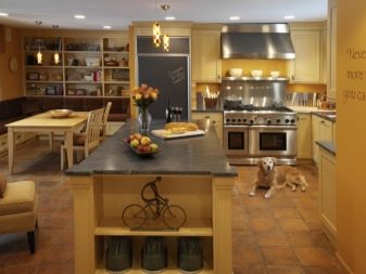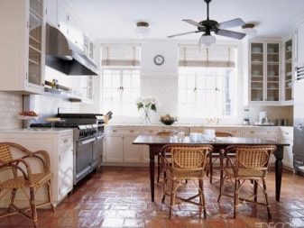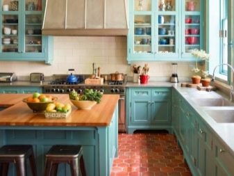 - Terracotta tiles in the kitchen looks very organic. Facing the floor and walls in the kitchen apron area are the most versatile options. In the stylized rustic kitchens, where there is, for example, a stove, the wall next to it can also be laid out with tiles. The use of bright yellow, saturated blue or gray colors will help to avoid monochrome and make the kitchen more light.