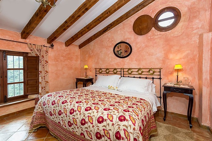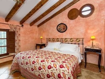- The cosiness of the attic bedroom in a rustic style is due to the use of matte tiles on the floor. Terracotta plaster on the walls and wooden ceiling beams and frames helped to convey the naturalness and originality of the interior. Textiles with printed patterns made notes of romanticism and lightness.