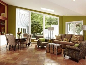 The interior, which uses terracotta tiles, gives a feeling of relaxation, security. Due to the fact that this shade belongs to natural, it harmoniously combines with other natural colors. While with artificial, the more acid shades it does not look.