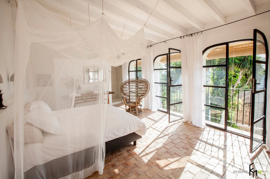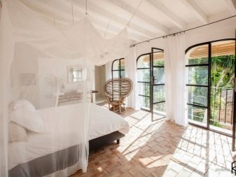 - A different stylistic effect was achieved in the bedroom of the Mediterranean style. The combination of terracotta tiles as flooring and rattan furniture, as well as white curtains and canopy - is the epitome of freedom, romanticism, sea freshness.The abundance of natural light and high ceilings - a prerequisite for such interiors. By the way, "greens" can be made directly to the room in the form of pots with palm trees or vertical gardening of one of the zones.