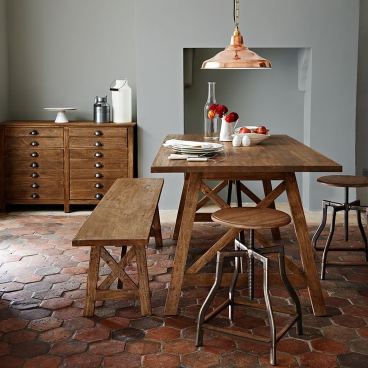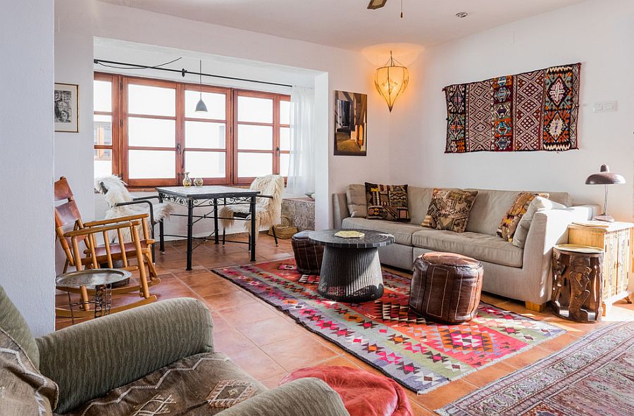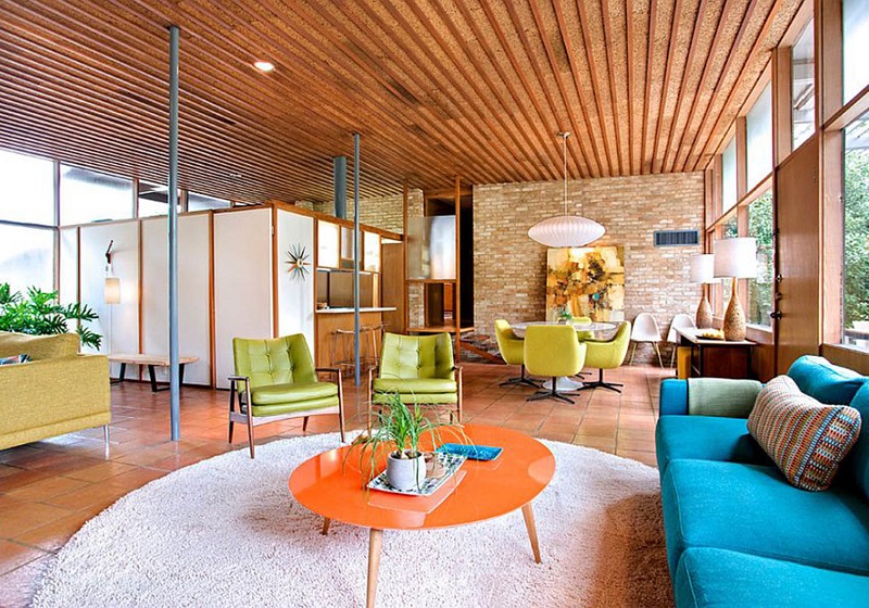 - The combination of terracotta tiles and bright shades of blue, orange, and green allows you to achieve originality of this stylish dining-living room. That terracotta is the base here and allows you to avoid the riot of colors.