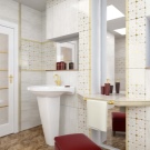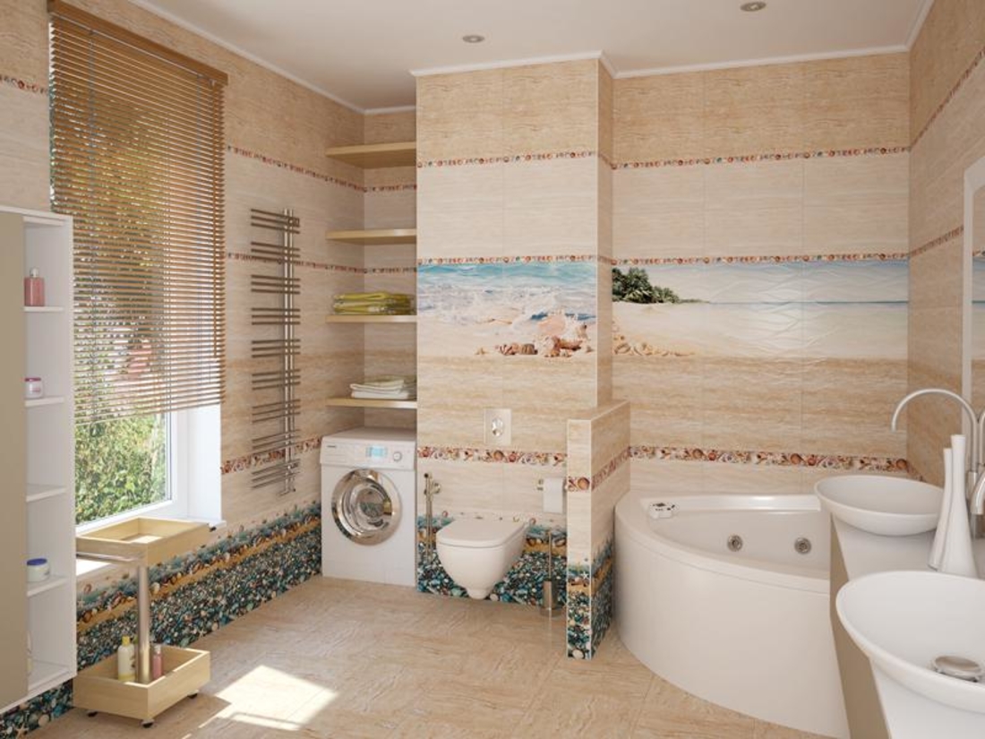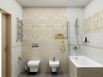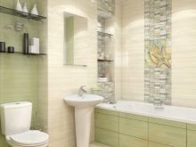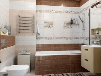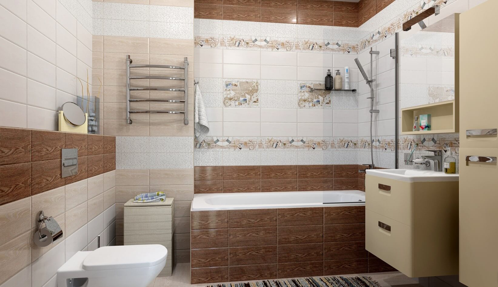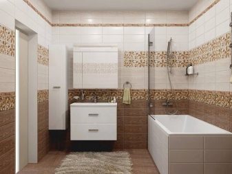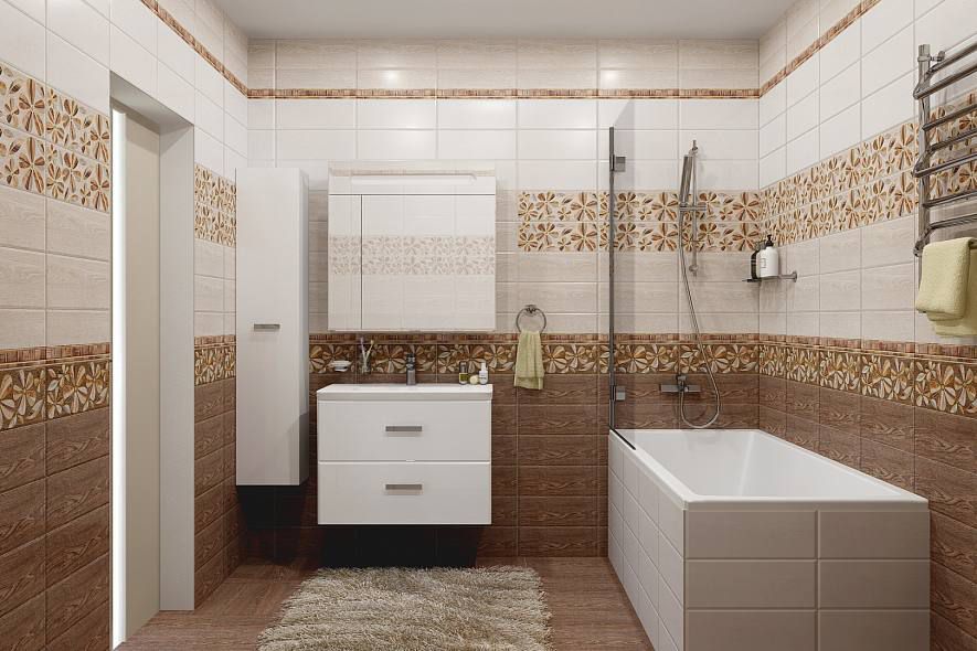 Matte wall ceramics are available in several versions. These are light and dark beige tones, smooth and embossed surfaces. The applied drawing is associated with patchwork. The color, texture and relief visually recreate the visibility of the quilted material. Borders are made in the same technique. If desired, they can be replaced with beige moldings.
