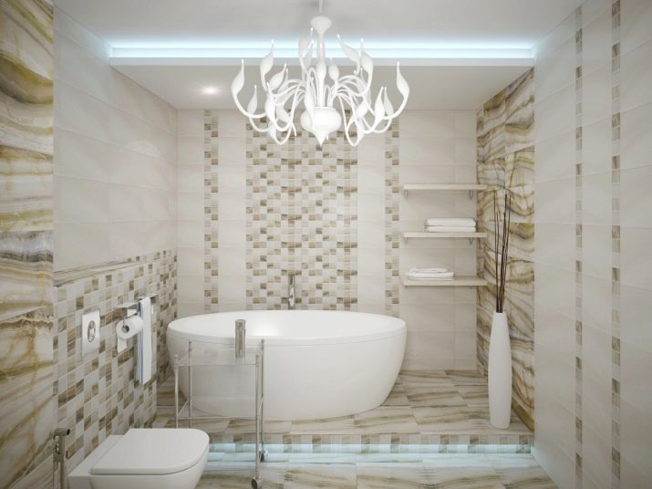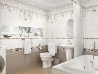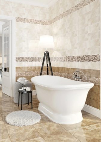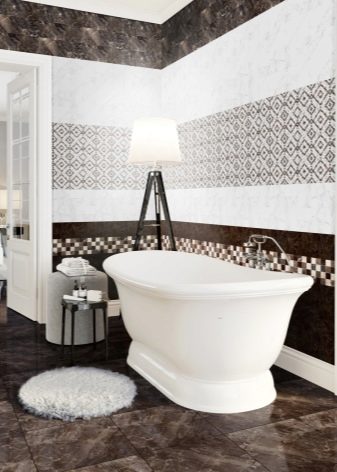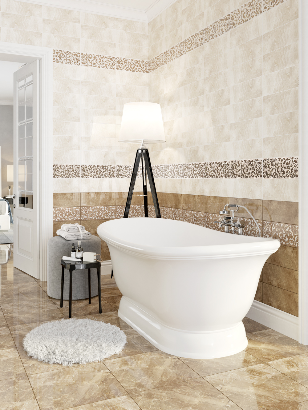 The wall tile is represented by white, cream, light and dark brown ceramics. The floor tiles are decorated with convex relief in antique style. Patterns on vegetable themes give the marble pattern a special sophistication. The material is not exposed to low temperatures, has dirt-repellent properties.