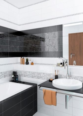 Wall tiles with embossed surfaceformed by a protruding pattern of hard-melted metallized glaze, giving the tile a luxurious shine and a polishing effect. Decorates the black and white series silver coating, which makes the design of products more expressive. Borders of similar color with a mesh pattern are an excellent complementary element.