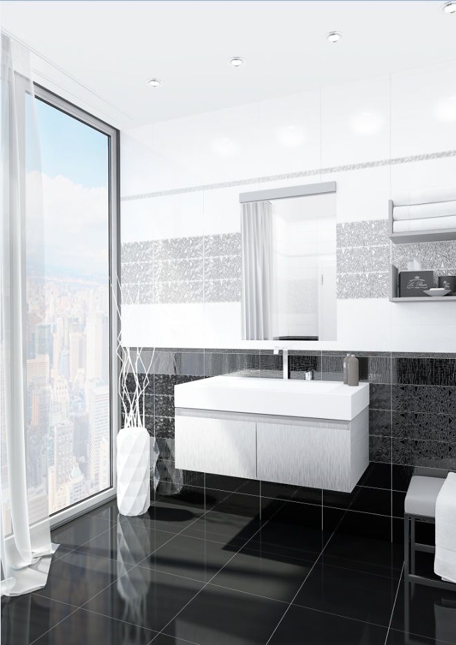 Akkord porcelain stoneware tiles are manufactured in 40 to 15 format. It is ideal for finishing bathrooms, kitchens and even spacious rooms. Like the Adamant series, this collection is made in strict black and white colors. This color scale has recently been increasingly used in fashionable design projects.