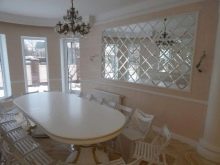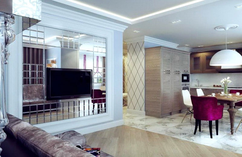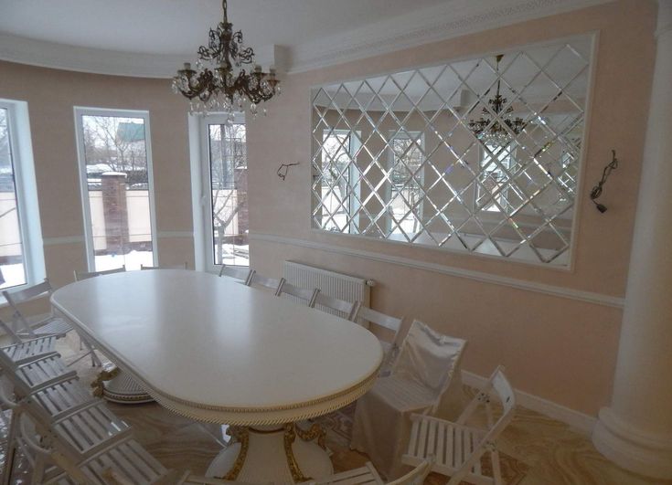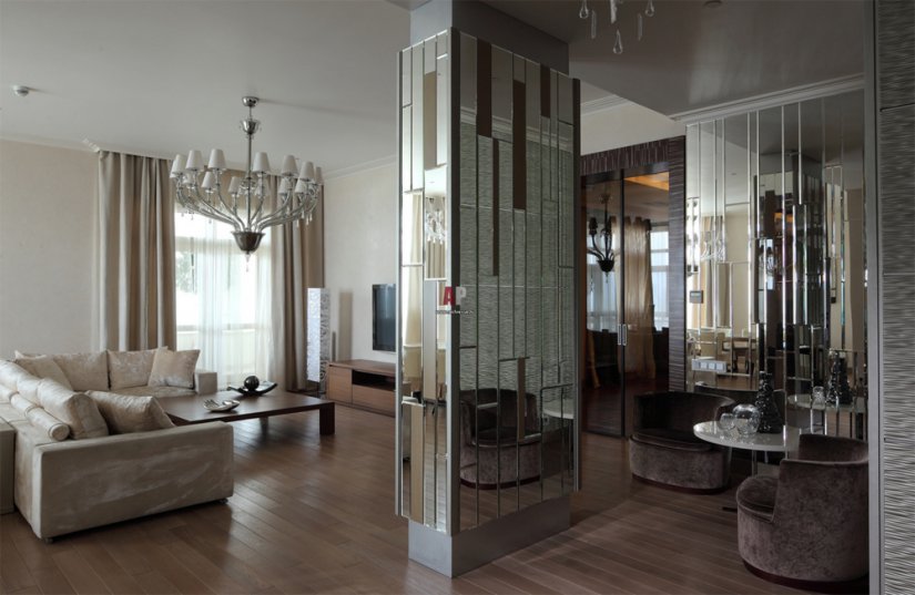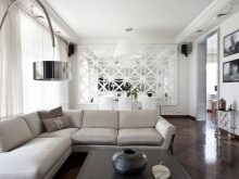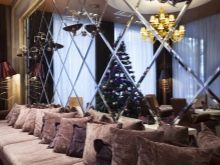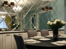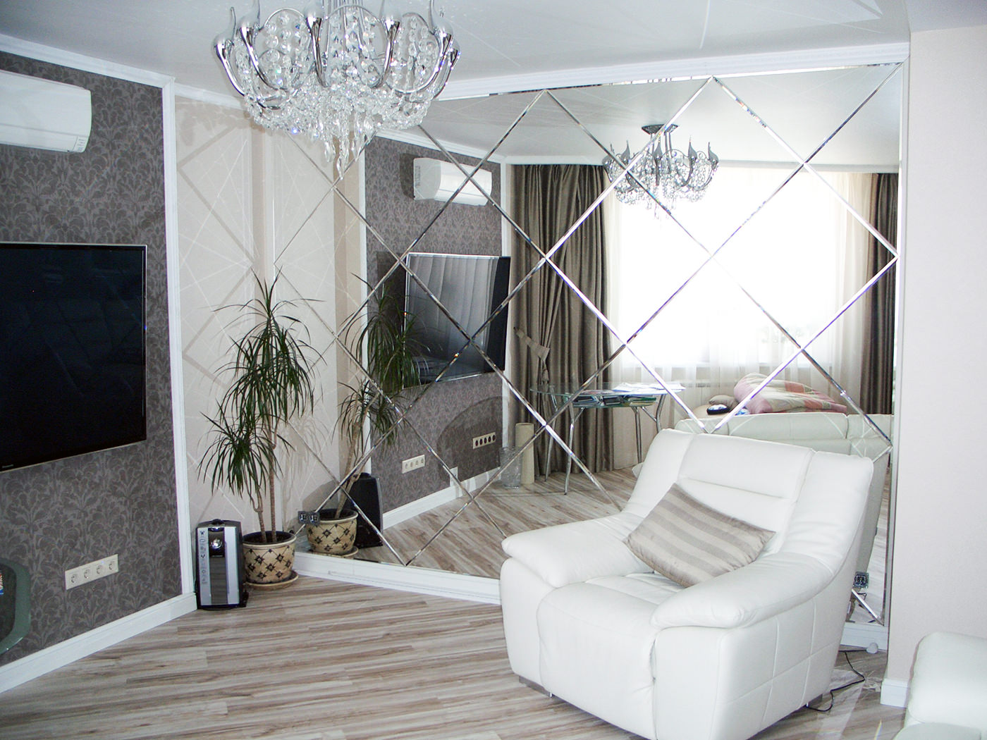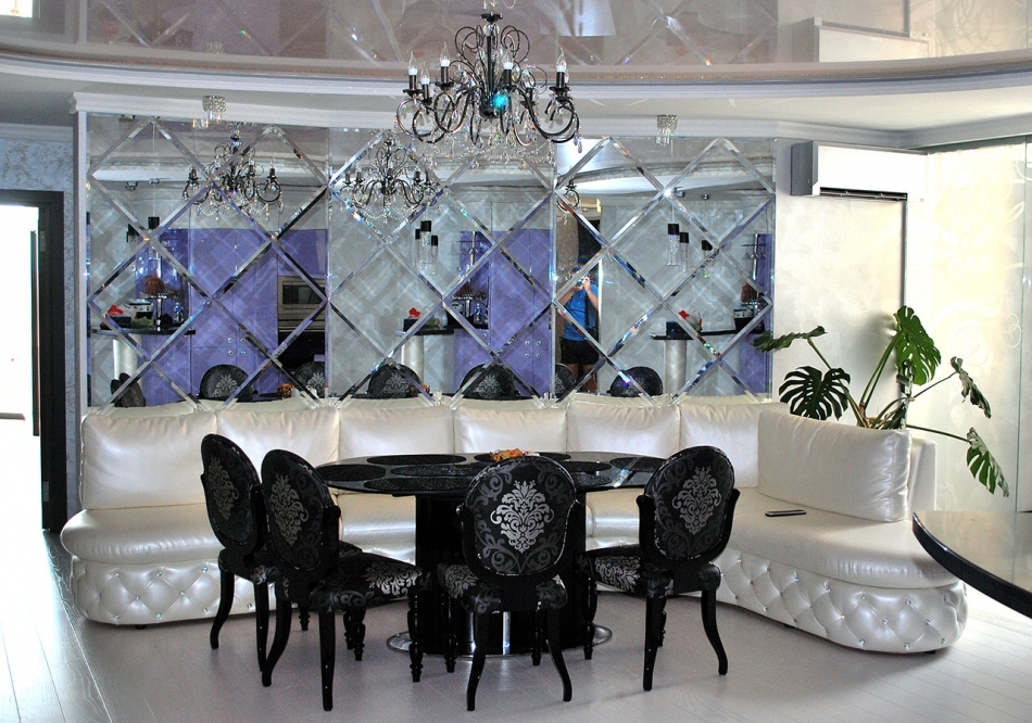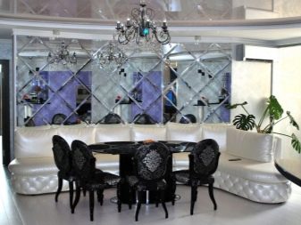Accent wall, decorated with large mirror tiles, will look great in a room with a glossy stretch ceiling and light floor. Place in front of her a luxurious white corner sofa with a four-piece carriage, and next to it is a black table with beautiful chairs. Hang a dark chandelier with curved horns above the table.