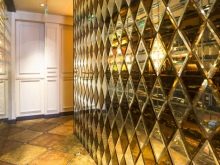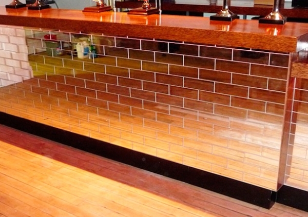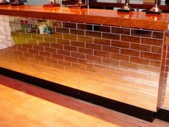 Mirror tile imitating brickwork looks unusual. Such a non-trivial finishing material will look amazing not only on the walls, but also on various interior items. For example, it may be a wooden bar with lacquered surfaces. On its frontal part the mirror “bricks” will look very original.