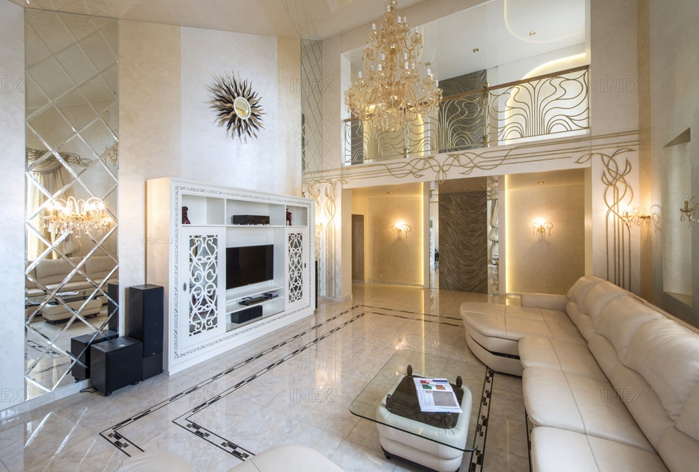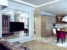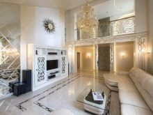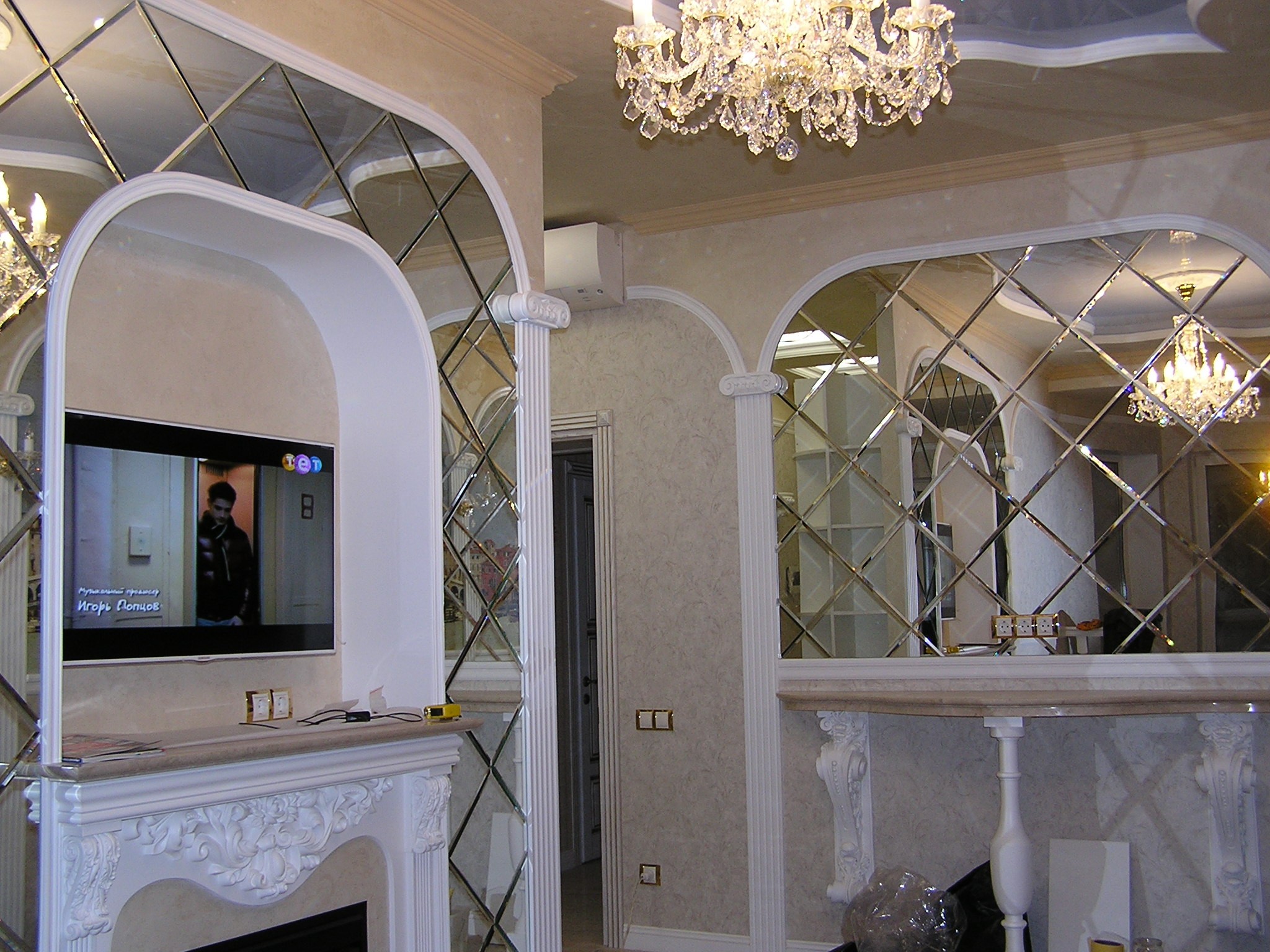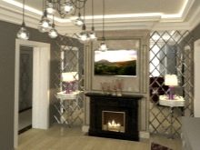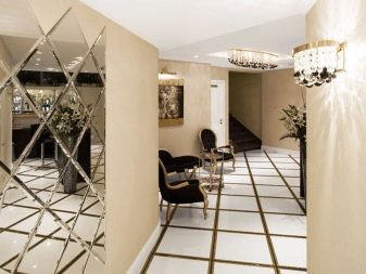 - In the modernist ensemble mirror tiles can be decorated luxury columns (if present), the ends of the steps and other interior details. Such elements are able to create a lighter and airy image of the room.