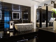 - In modern style It will be interesting to look spectacular black tiles. However, we should not forget that the use of too dark paints often creates the effect of a more compact and cramped room. Because of this, it should be used very carefully and only in a spacious room.