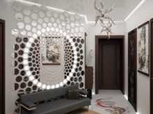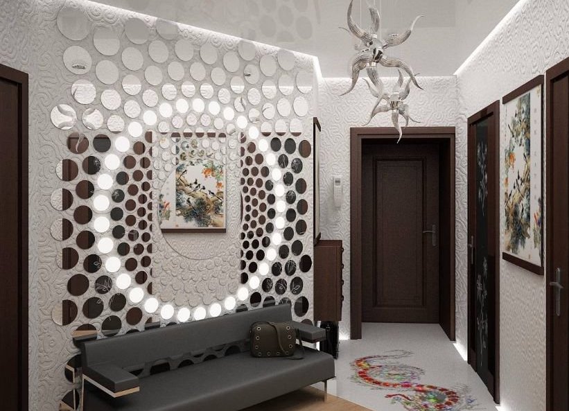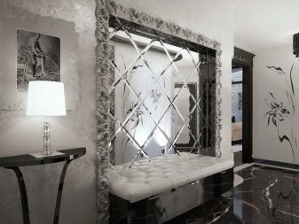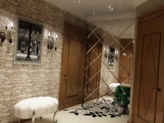Accent reflective wall will look great in a small corridor with floors, trimmed with artificial or natural stone. The floor in such a room should be decorated with light tiles, and the ceiling with a milky stretch film. Put a snow-white banquette with curved metal legs near one of the wooden doors.