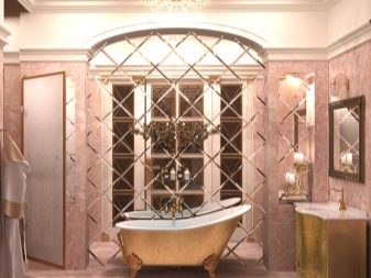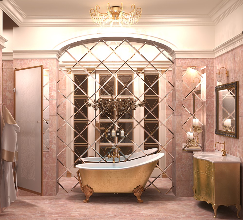 In the bathroom, decorated with pale pink tiles, it will look spectacular wall, floor to ceiling, decorated with reflective mirrored tiles. Opposite it, you should put the bath itself (it is advisable to choose a model in an elaborate or classic style), and to the side of it there is a cabinet with curved legs and a fancy-style faucet.