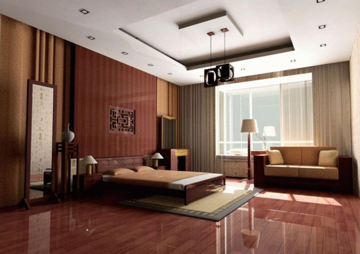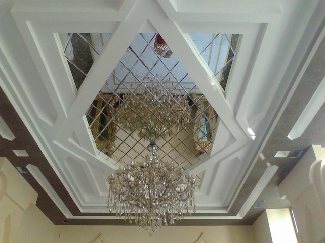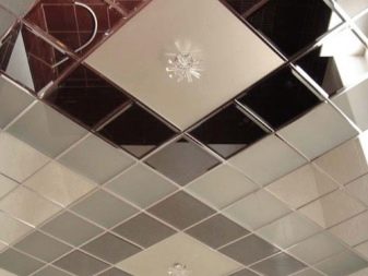 Spectacular diamond tiles made of PVC material will look amazing on the ceiling in a room with light walls.Supplement the light-reflecting panels with small lighting fixtures, and the situation will become lighter and more presentable.