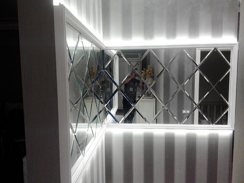 A standard mirror is a rather dangerous object, as it has sharp edges. That is why in the development of mirror tiles, it was decided to cut the edges of the panels at an angle. Edge width is often 40-50 mm. This part is called fatset.