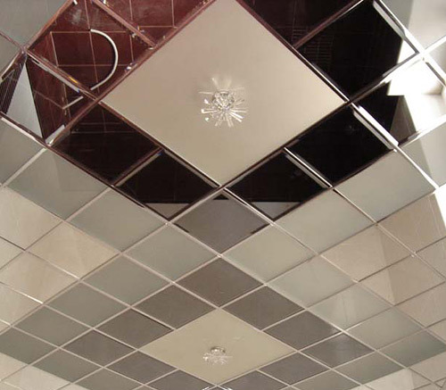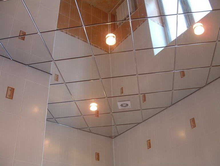 No less organic in the design of the ceiling will look a combination of mirror plastic tiles with frosted inserts of the same material. Such a design decision will revive the interior and will not cost too much, because PVC tile has a reasonable price.