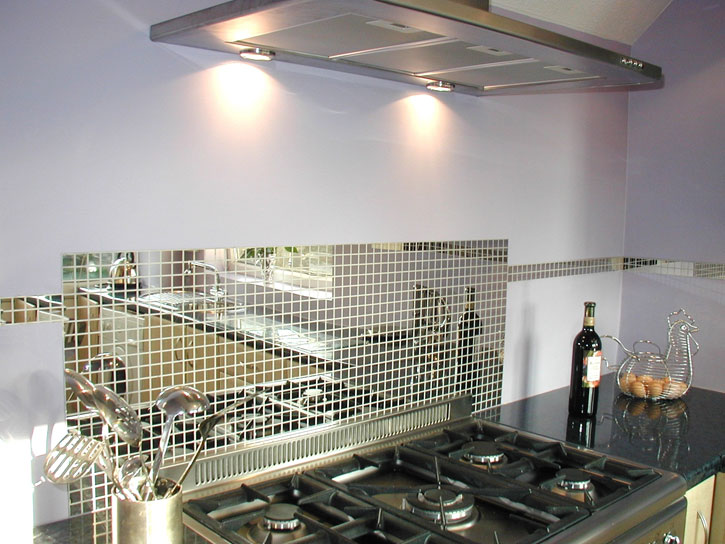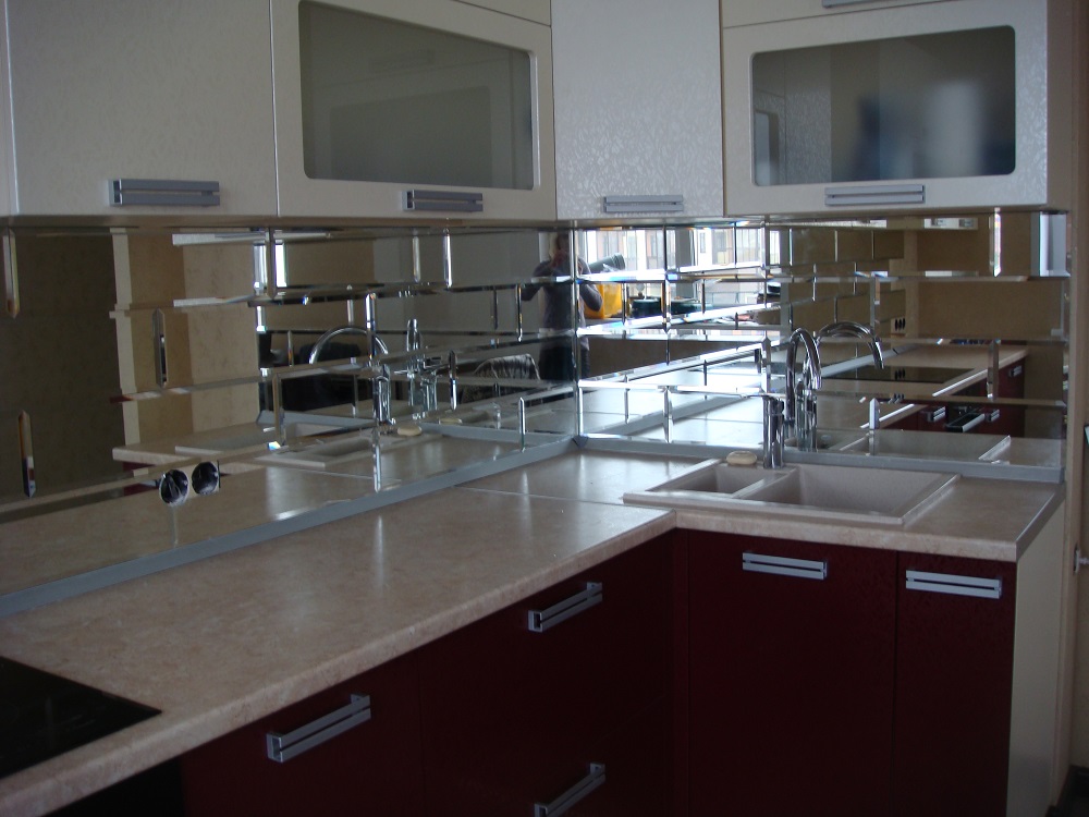 - On the kitchen glass tiles should finish a certain part of the walls. However, do not forget that too much mirror coatings will cause a lot of trouble for the hostess, because they are well visible dust and fat stains. Designers recommend using such a spectacular tile only in a small kitchen.