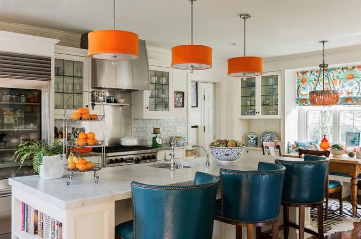 Orange and scarlet chandeliers perfectly complement the interior of the kitchen or living room. These colors, as scientists have found out, cause appetite and are perfectly combined with cutlery, reflecting in them and giving a "tasty" shade to the room.