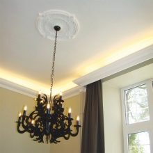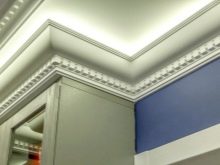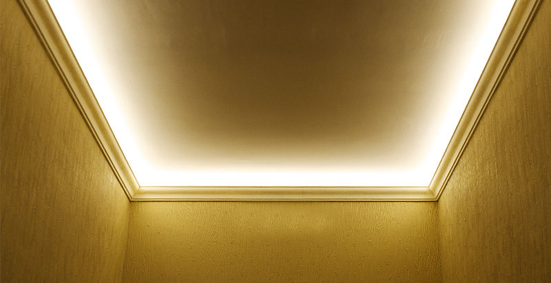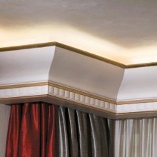 Lighting eaves should be chosen as an auxiliary element. Together with the main light, you will receive a bright and festive interior, which will be optimal for the living room, where households often gather in the evenings.