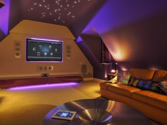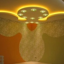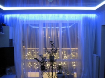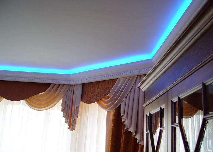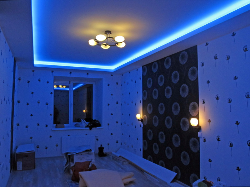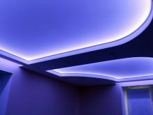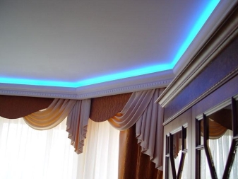 In the role of a key lighting element, you can use neon lights with the desired color and shade. In the role of auxiliary lighting used side-type lighting. Such a design will harmoniously look only with a perfectly smooth coating without defects.