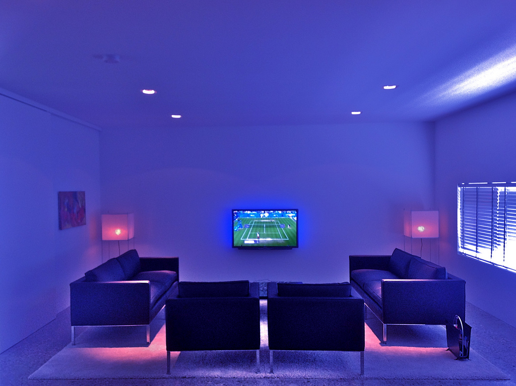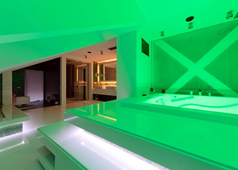 Some apartments boast a lighted floor. Such a solution looks spectacularly paired with eaves and ceiling lights. With this lighting solution, you can zoning the room, emphasize the perimeter of the floor and highlight the various shapes of geometric shapes.