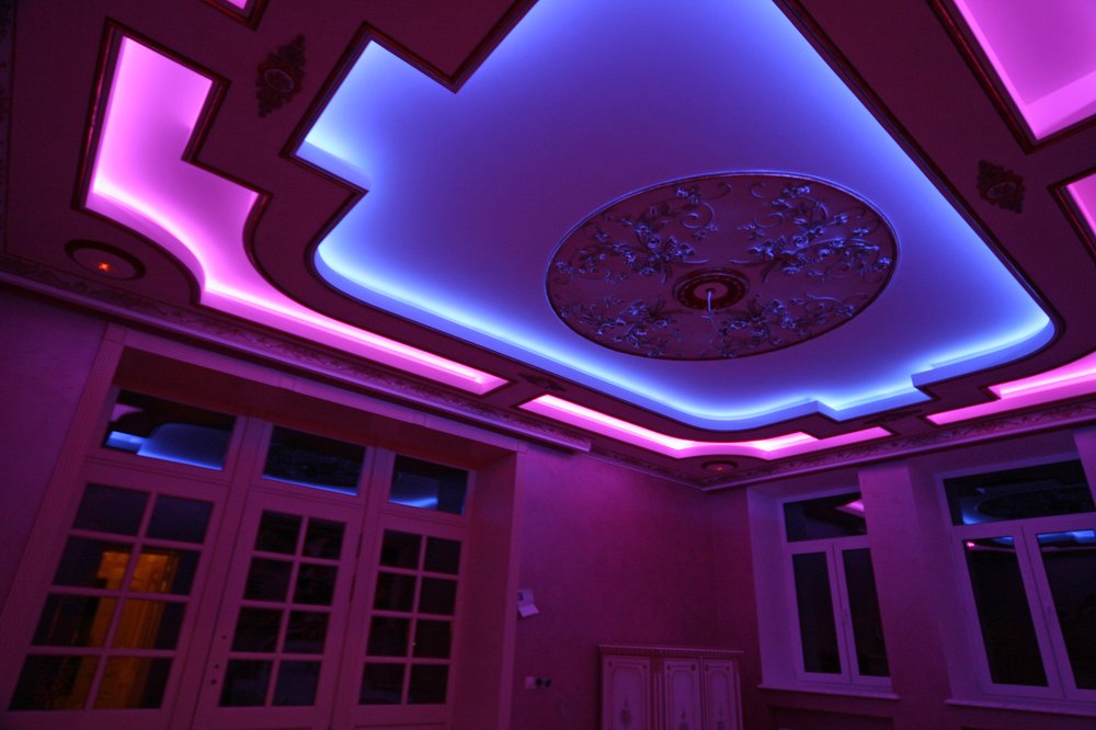 You can decorate the ceiling in your apartment with neon lighting. Such an addition is able to focus well on the various designs of the ceiling, its unusual forms along with the projections and levels.If you decide to use the slit illumination (this method implies the visibility of light without visualizing the lamps themselves), you can visually increase the area of the room by getting the ceiling to “float” and its individual elements. Such a warrant will be perfect for small spaces.