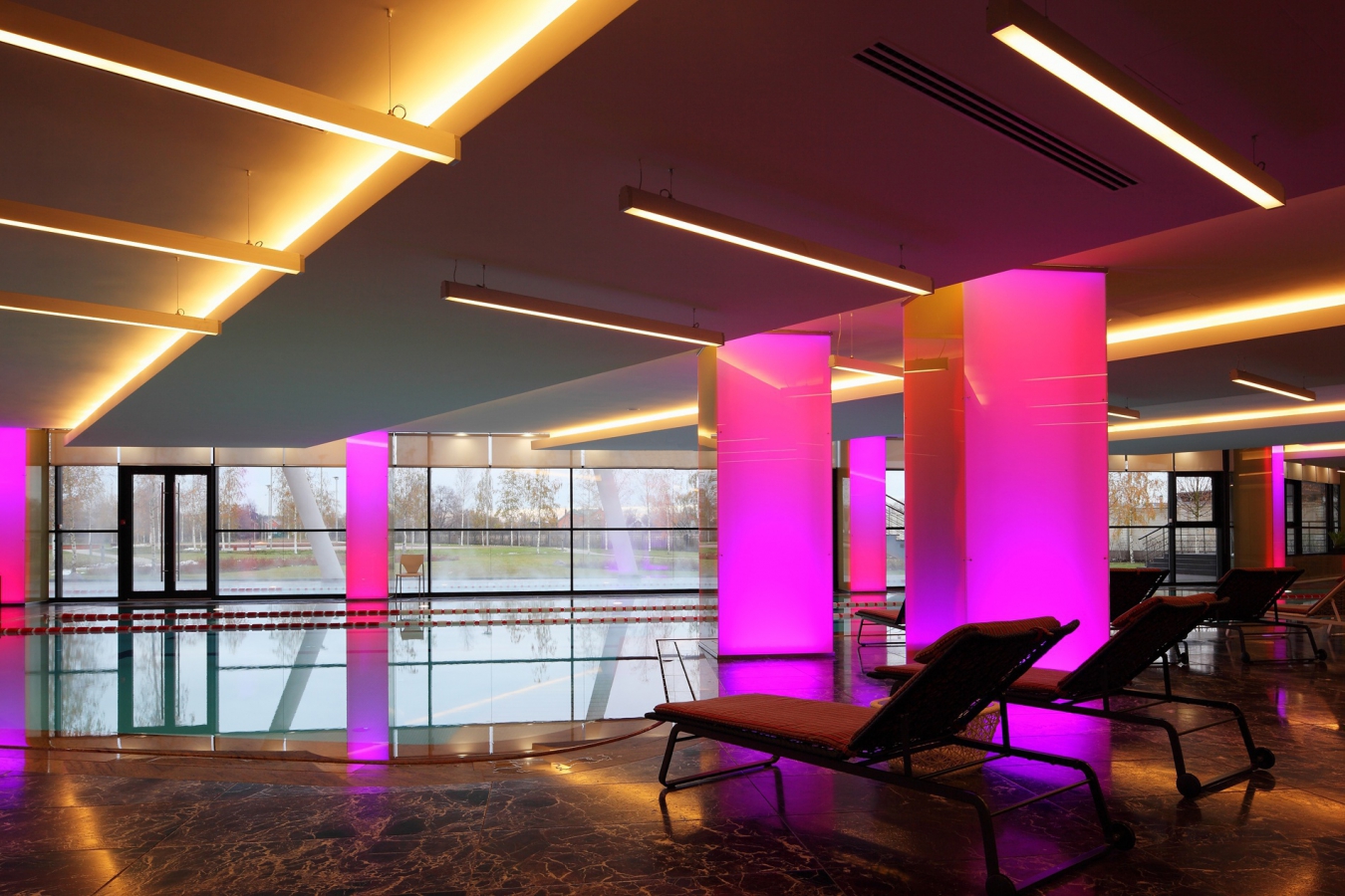 Slit backlighting with a soaring effect is actively used. It is installed around the perimeter of the floor.