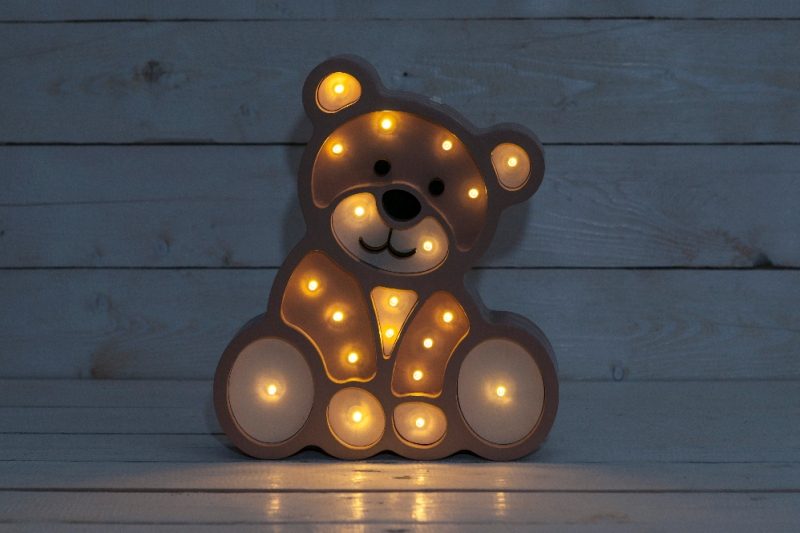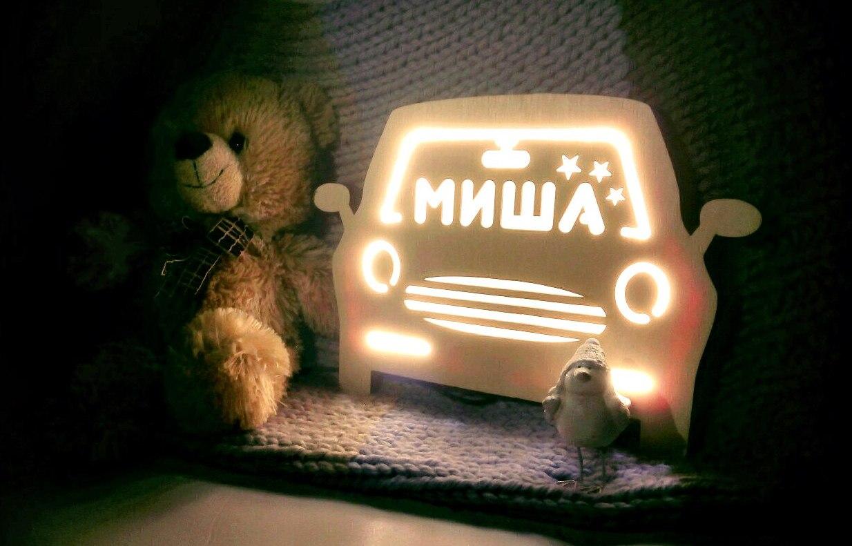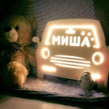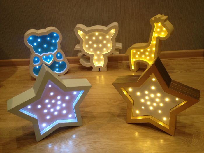 - Baby. The night light for children should be more vivid and interesting to please the baby with its appearance. Often parents buy lamps for their children in the form of cute little animals or well-known cartoon characters. In the case of wooden structures, you can also find a lot of interesting things. You should also pay attention to the LED nightlights, because buying such a lamp you get the opportunity to control the brightness of the light and the movement of its rays.