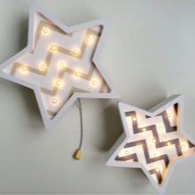 - Threaded. Since the tree easily takes the desired shape, many decorate products made from this material with beautiful carvings. It can cover only the base or the entire night light. The most common options for decorating night lamps are shaped carving or stars. If you cover the surface of a wooden ceiling with stars, the light will pass through them, beautifully reflected on the walls.