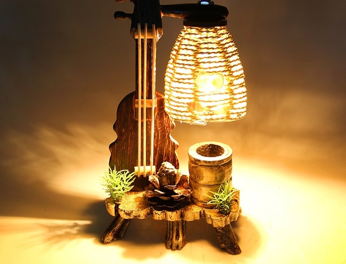 - Elegant confusion. Another simple idea that can be translated into reality, even being far from the design world, is a lamp tied up with threads. Bright thin threads in this case serve as an element of decor. They make the atmosphere in the room more comfortable and pleasant, because the wood is perfectly combined with textiles and with yarn. Another best option is to take a string. You can decorate the finished lamp this way or work with wood from scratch.