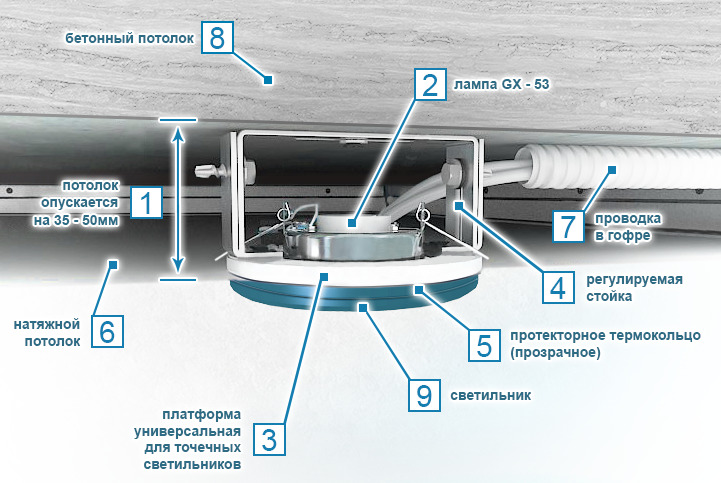 - Mount the lamp by screwing the legs of the rack to the ceiling in the recess. Attach to them a rack of lamps. The ceiling canvass should first be strengthened with a tread ring inside and insulated from the outside, this will prevent the ceiling from breaking. Attach a luminaire to the finished structure.