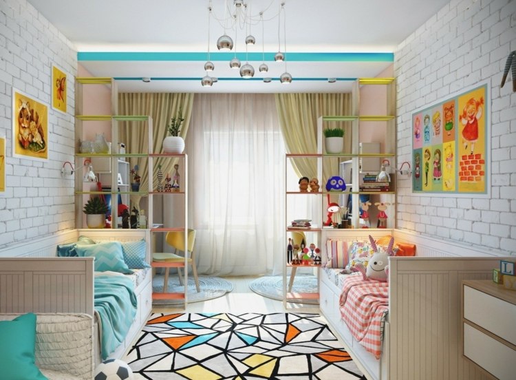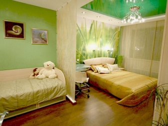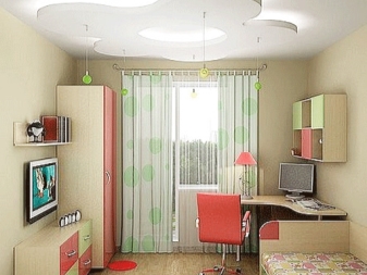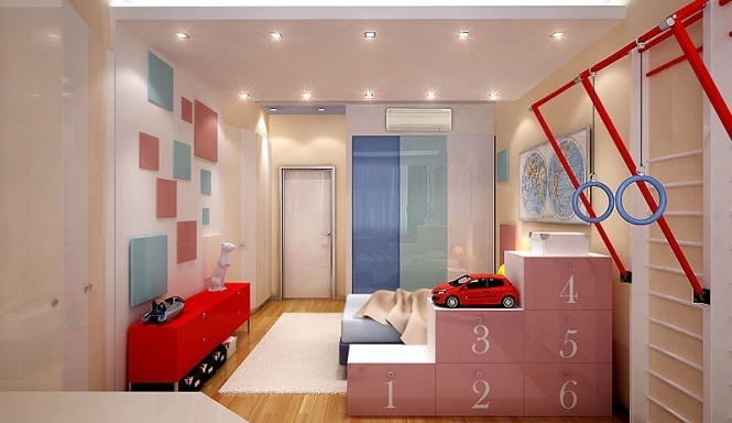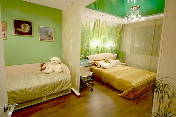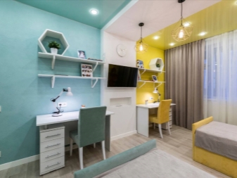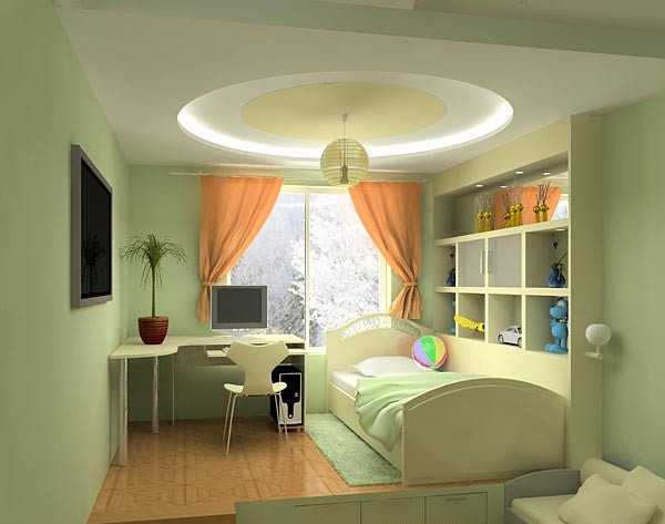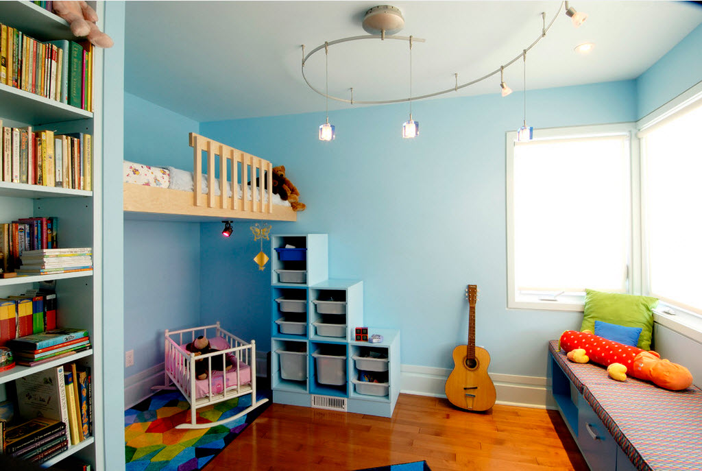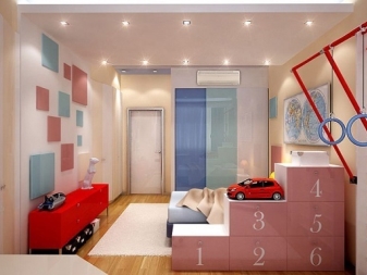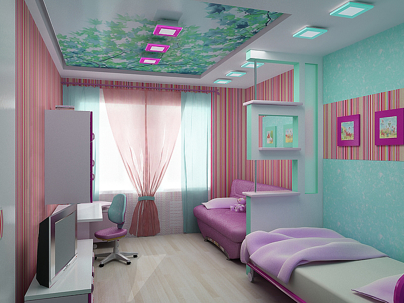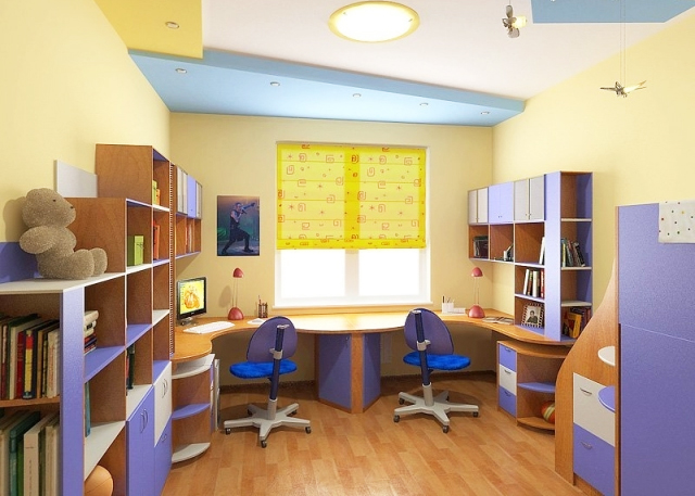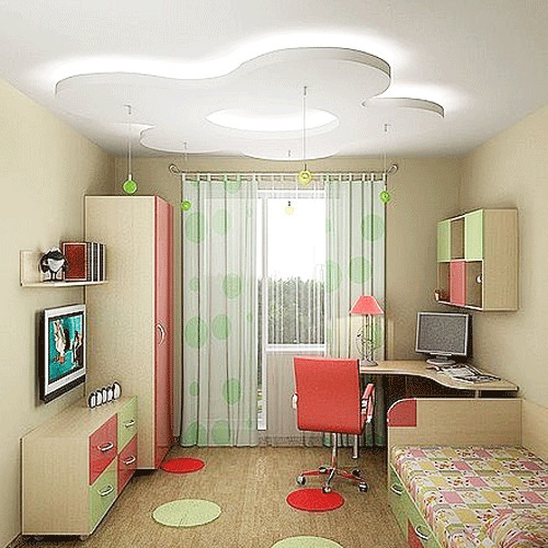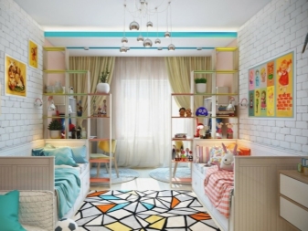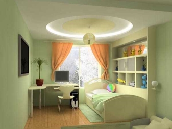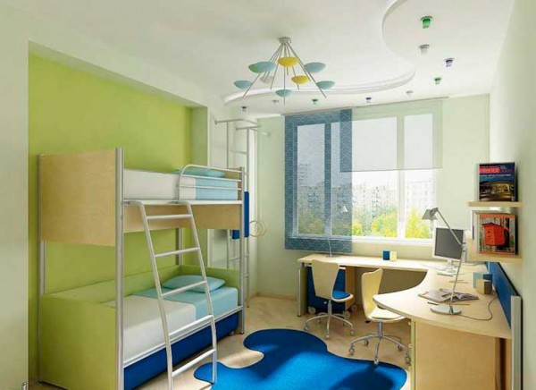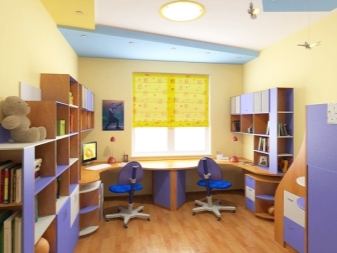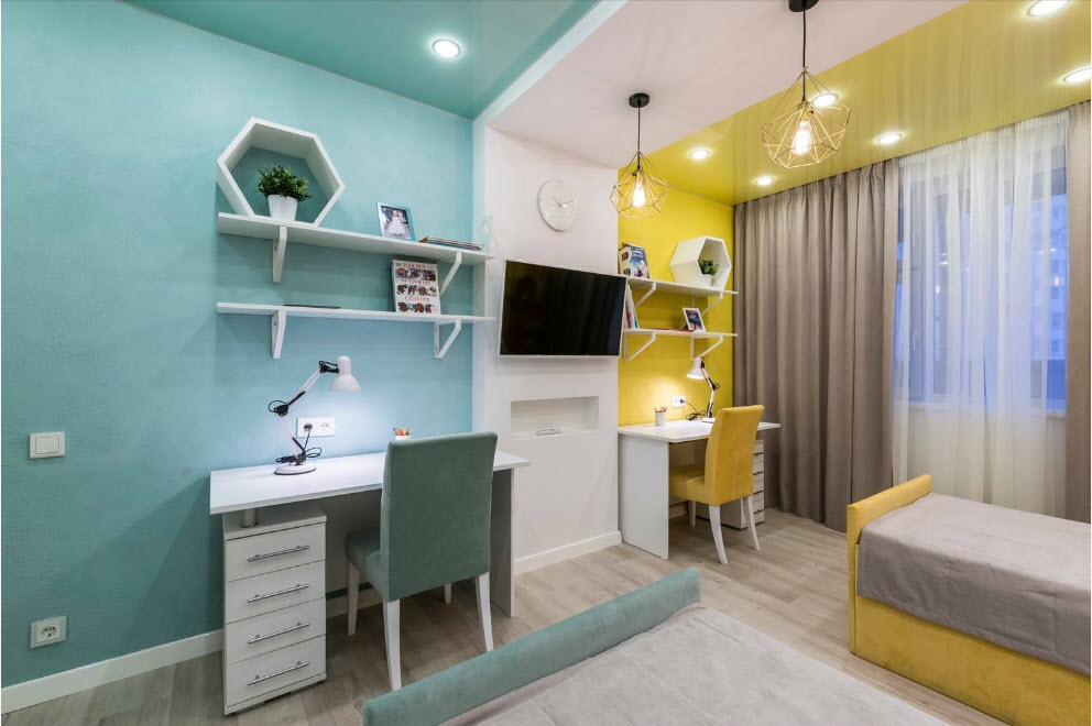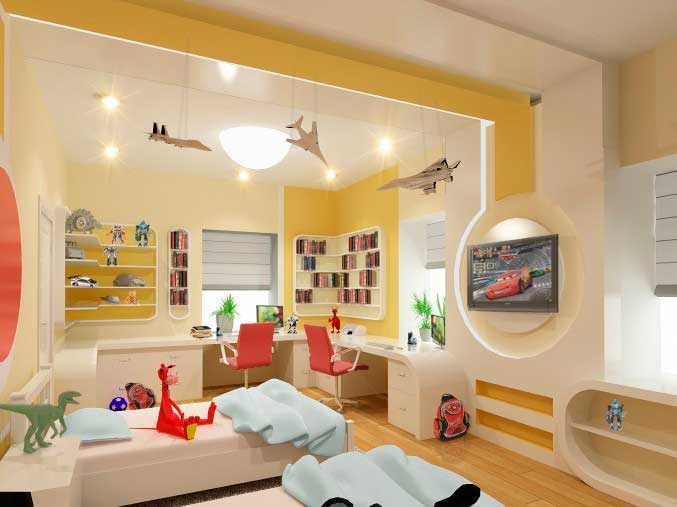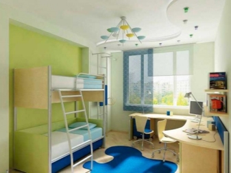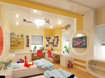 If the room is shared by children of different ages, then it is better to divide it into special zones. Halogen bulbs that are installed on a false ceiling are perfect for this.