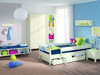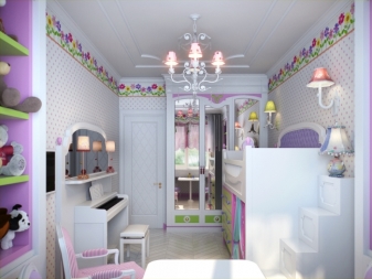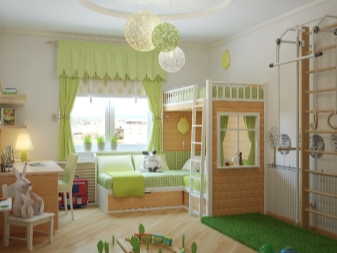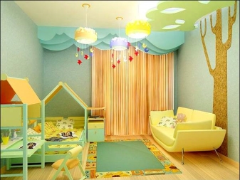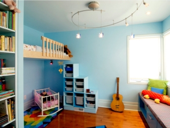 The brightest of all should be the play area of the baby. Here you can hang a bright lamp or lamp. If the room has an elongated shape, then it will be interesting to look at some bright lamps located along the wall.