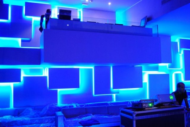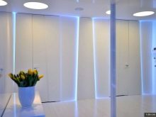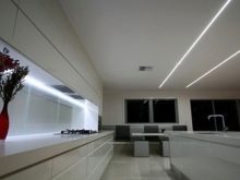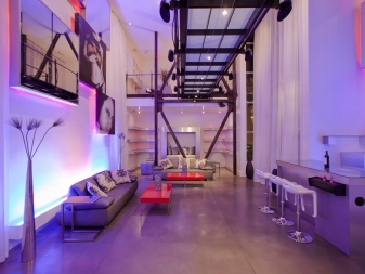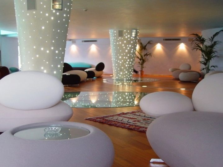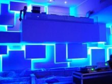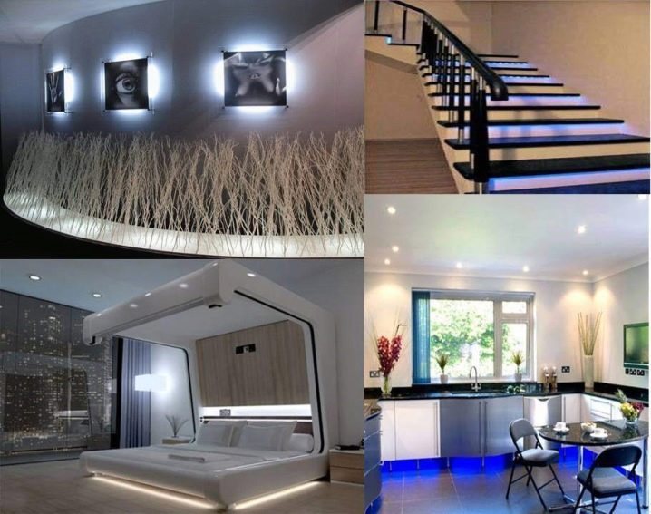 Any discreet interior can be revived with decorative lighting. Background illumination can combine spotlights with LED or discharge cords. A striking example of this is the style high tech.