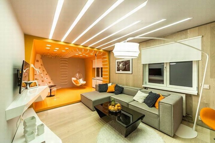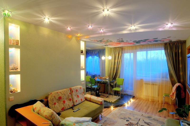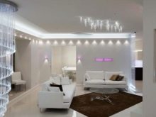 In the living room just apply a multi-level scheme.When the whole family comes together or when meeting guests, all devices will be used. If there is no need for such a festive illumination, you can leave some part included.