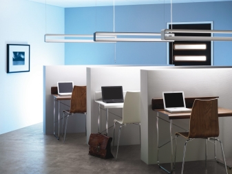 - Cool white with a blue tint is more used in offices, schools and other educational institutions. Creates a working attitude, helps to gather, stimulates the brain. For him fit LED and fluorescent lamps.