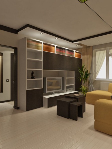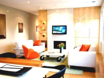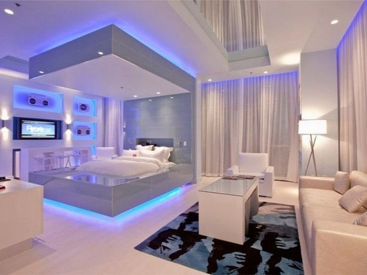 Suspended multi-tiered ceiling, as well as niches in the walls will look particularly impressive with light. With the help of local lighting (for example, light cornices, wall sconces, table lamps) you can make a zoning of a studio apartment.