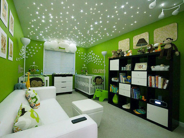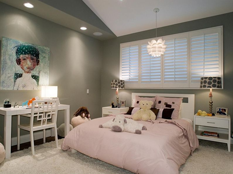Children's room fit lamps, closed with matte or opaque lampshades. Here aesthetics are preferable to safety and practicality, as well as compliance with all regulations and standards. If the child has already gone to school, it is necessary to place additional electrical appliances near the desk.