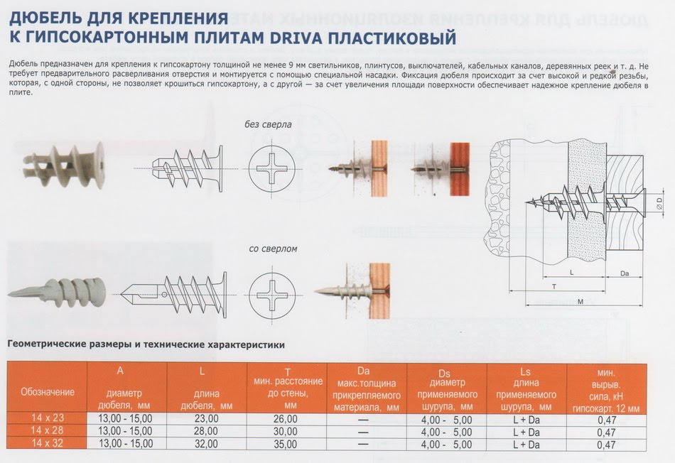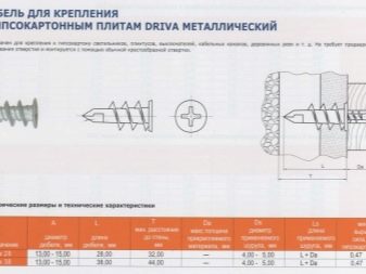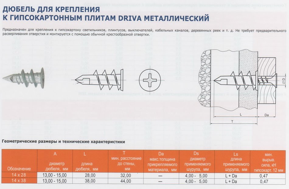 Manufacturer Driva in the manufacture of fasteners for drywall uses harpoon and expansion principle of operation. He is the key to excellent fixation.