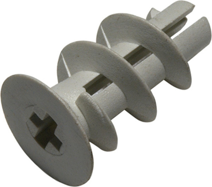 Another type of fasteners for gypsum boards. Its configuration includes a plastic base for the screw. During installation, it is firmly pressed against the joint with the material and securely fixed with a screw. This feature provides protection against falling out of the sheet.