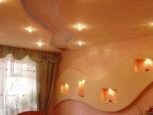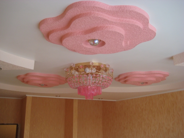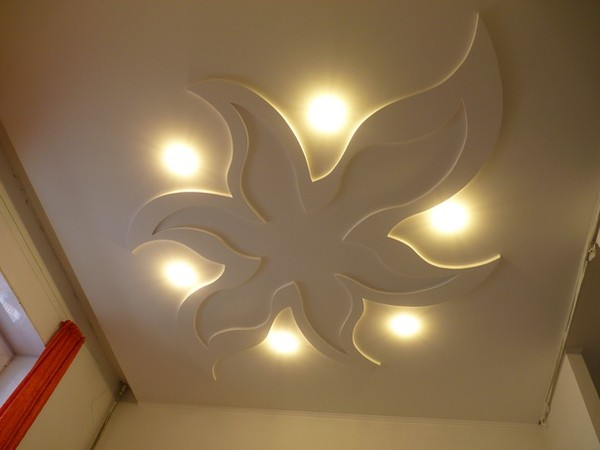 When the drywall parts are ready, you should mark the ceiling or walls, noting the locations of the supporting fasteners. The distance between the tiers and the ceiling should be at least 8 cm for ventilation and installation of lighting devices. The wiring for the lamps and the frame of the profile is mounted simultaneously. Flower petals can be volumetric (indented from the first tier) or in one plane, it all depends on the design decisions.