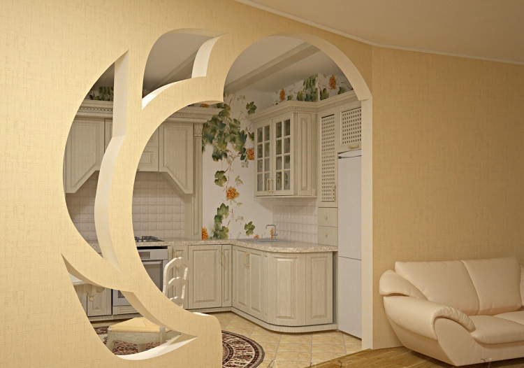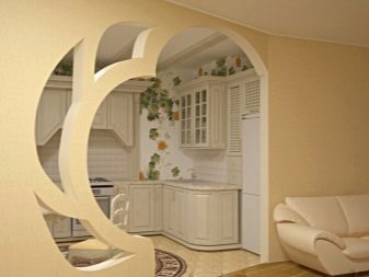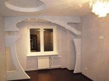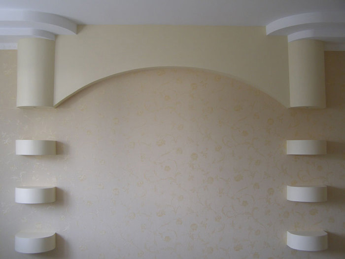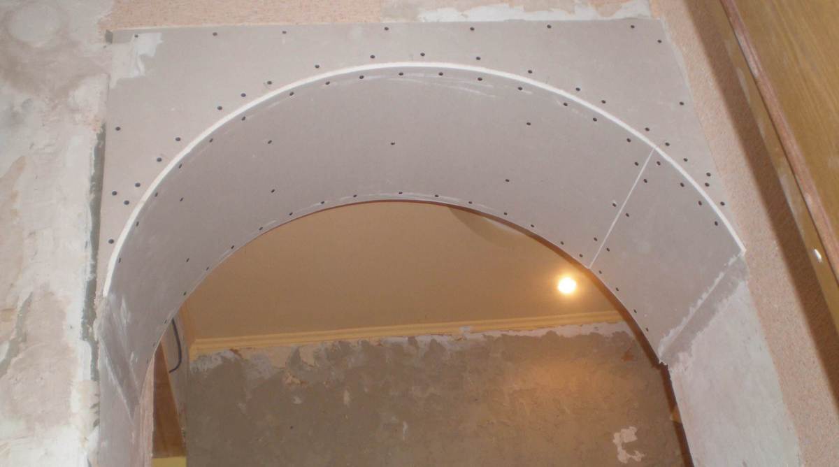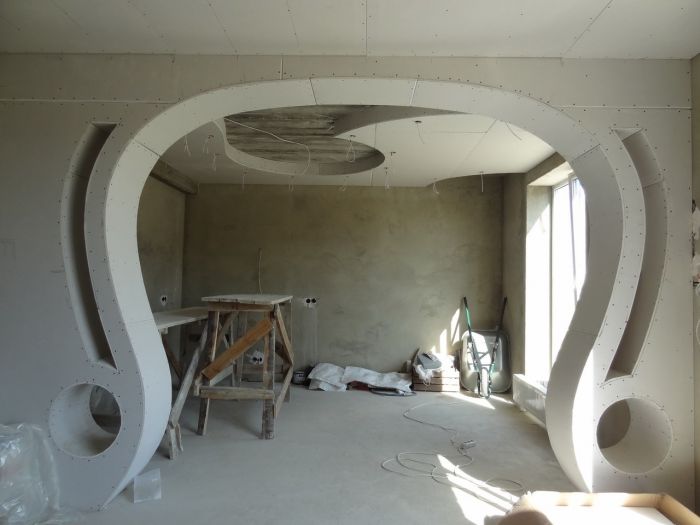 The method is quite simple, for it should choose a thin arched drywall (6-8 mm), which bends easily. Material can take the necessary form, having bent to 10 cm.Before you start working with drywall, you should prepare the frame on which it will be mounted. To do this, on one of the sides of the profile, cuts are made and bent in the form of an arch, giving the necessary shape. Elements of drywall screwed with screws to the profile at a distance of 25 cm from each other, gently bending along the frame.