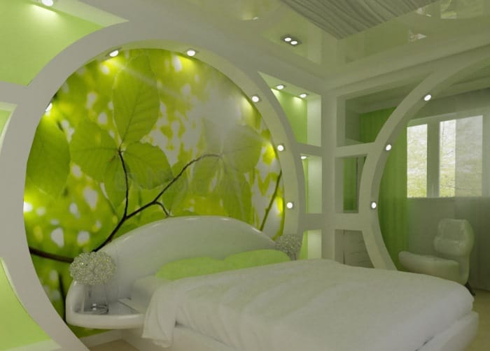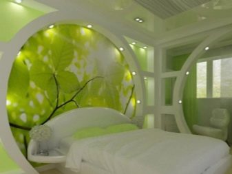 The delicate airy interior of the bedroom in combination with the decor of the color of fresh greens looks impressive.