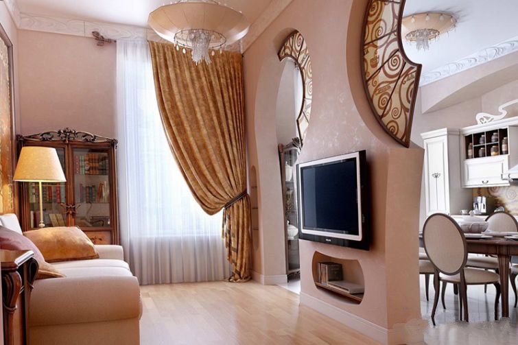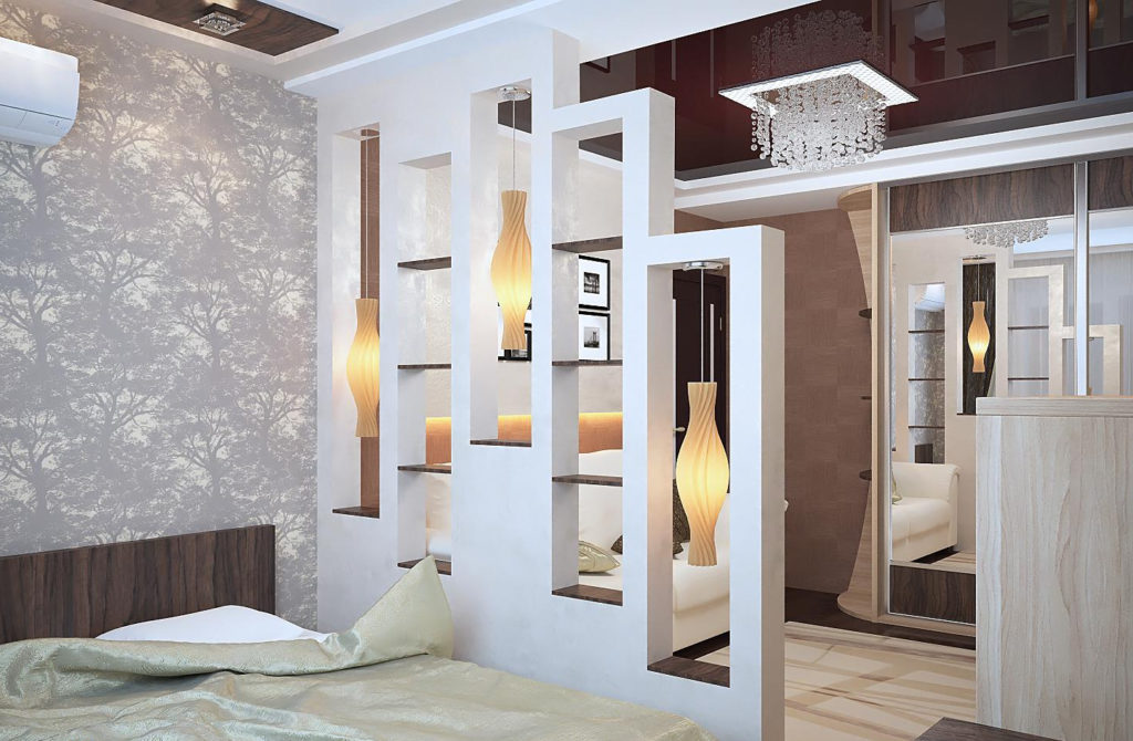 The whole design of the apartment is made with the participation of drywall. The zonal division of the arches, the shelves, the ceiling - everything is beautifully made of this material.