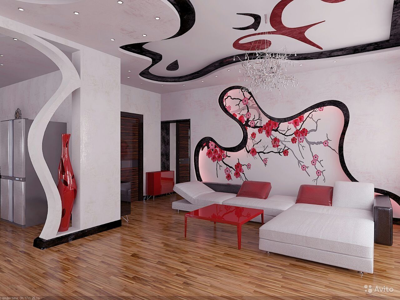 Starting to work with drywall is better with the execution of simple shapes on the wall. Ceiling design requires some effort and experience. Using fantasy, on the walls you can create real art canvases in a three-dimensional image. With the help of patterns, the surface is drawn out or expanded. Complicated abstract drawings make the room rich and rich.