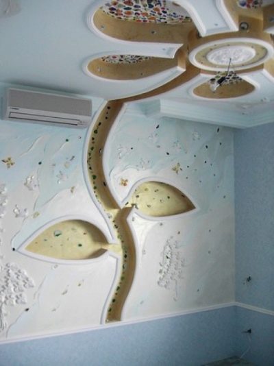 There are 2 ways to create structures on the wall: with glue and on a frame basis. Cutting the figures out of drywall, they are mounted on a prepared wall with the help of silicate glue or mortar. For volume, you can build up figures in several layers. To decorate the plane in one level, simple geometric shapes, abstract elements or artistic blanks (for example, flowers, butterflies) are cut out of drywall sheets.