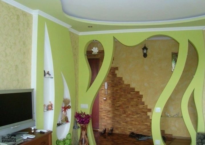 Drywall is produced on the basis of gypsum - a material that is durable and fragile at the same time. With careless installation, it breaks easily, but a properly made design can withstand a lot of weight (books, equipment, construction tools are placed on the shelves). Decorating rooms with the help of drywall seems fantastically fascinating. He will turn into a fairy tale any boring room.